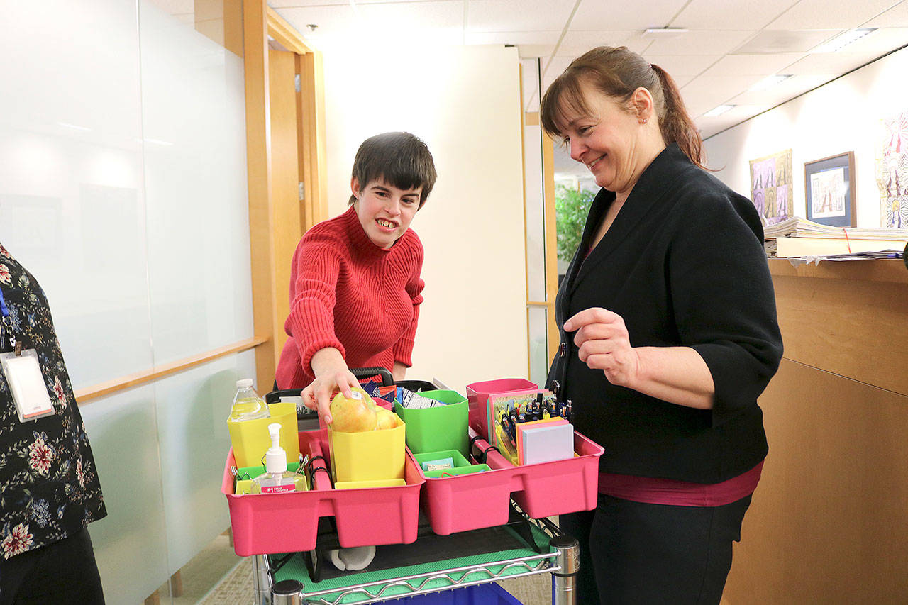 With the help of AtWork!, the law firm created a cart for Paige to push around the office. She walks around the office, with the support of her current employment counselor, handing out snacks and office supplies to her coworkers. Paige also delivers mail around the office in a cart that was specifically brought in for her. Paige’s current AtWork! employment counselor, Emily Lord, helps her navigate the cart around the office twice a week. Lord provides one-on-one support for Paige, as she needs help navigating around the office and communicating verbally.
