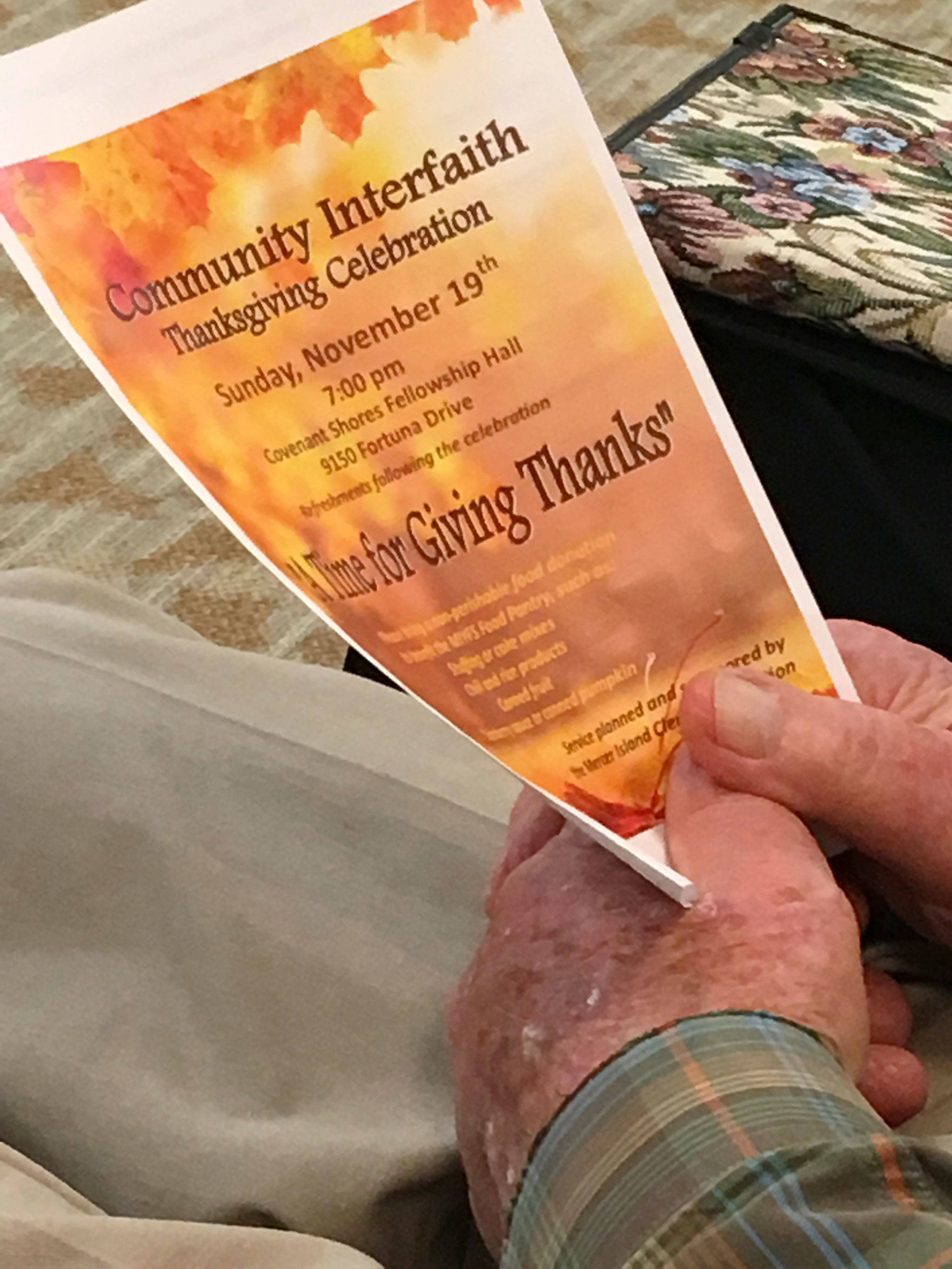 Thanksgiving meditations were given by Chaplain Greg Asimakoupoulos, Sue Wanwig from Holy Trinity Lutheran Church and Susan Morrison, an interfaith minister. Rev. Roberta Rominger read Lincoln’s Thanksgiving Proclamation. The Covenant Shores Chorale (under the direction of Donna Palmberg) sang an anthem.