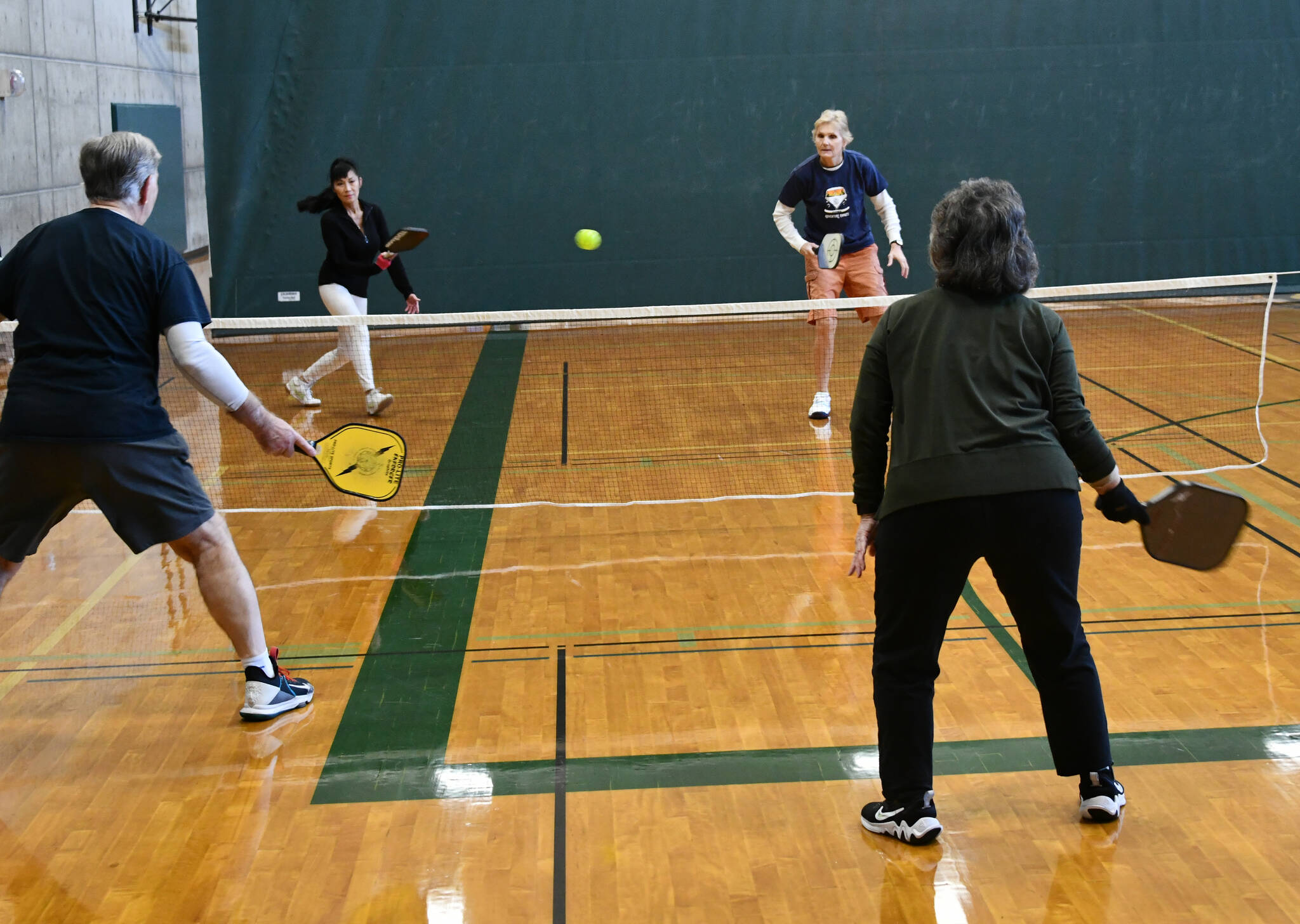 After the three-court volleyball session — which featured about 30 players — finished, city staffers transformed the gym into a six-court pickleball wonderland for 24 enthusiasts wielding paddles and smashing neon yellow plastic balls to and fro.