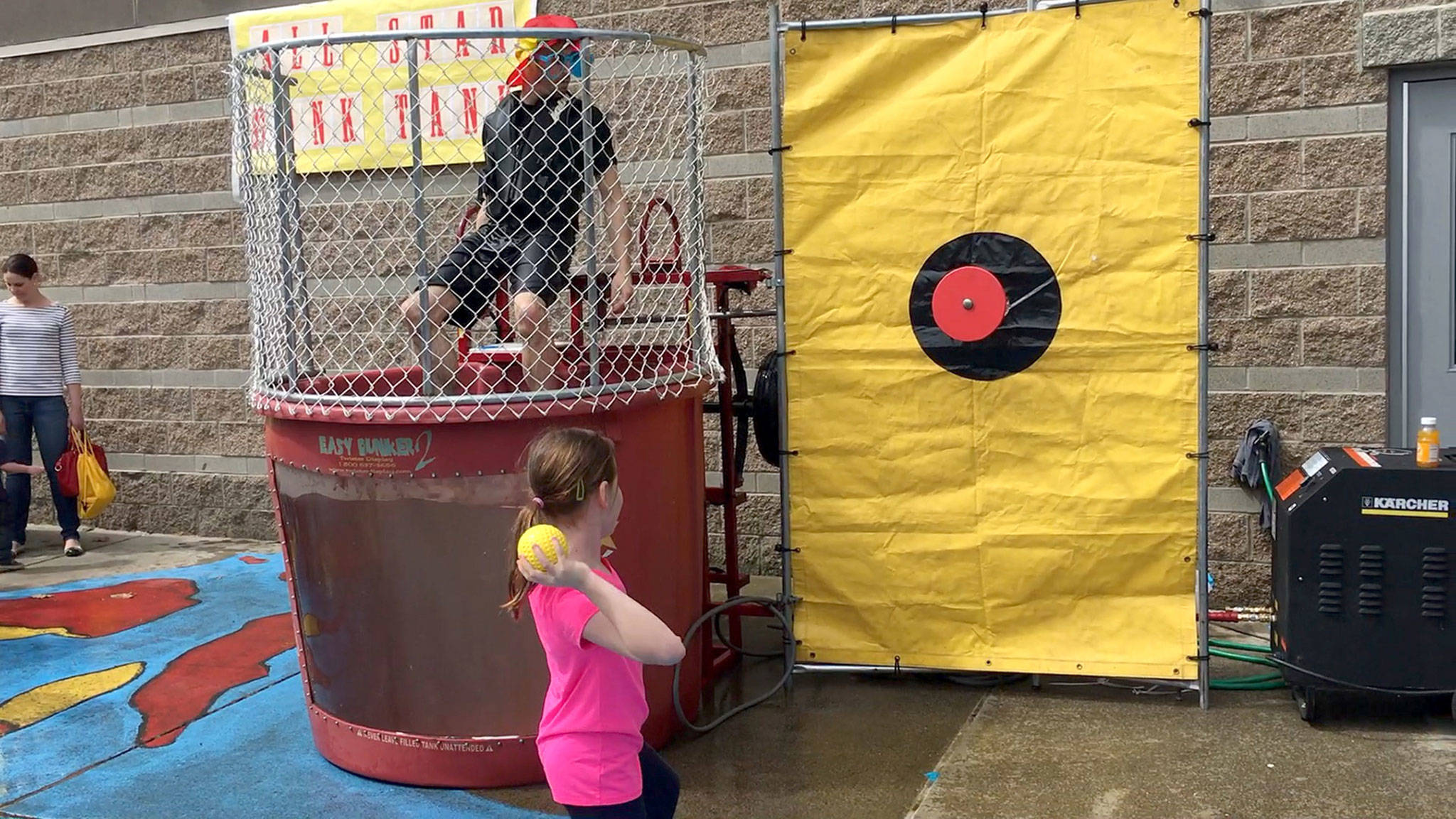 Activities include a trampoline, a bounce slide and bounce houses, an obstacle course, break-a-plate, bowling, mini golf, crafts, face painting, a photo booth and a dunk tank.