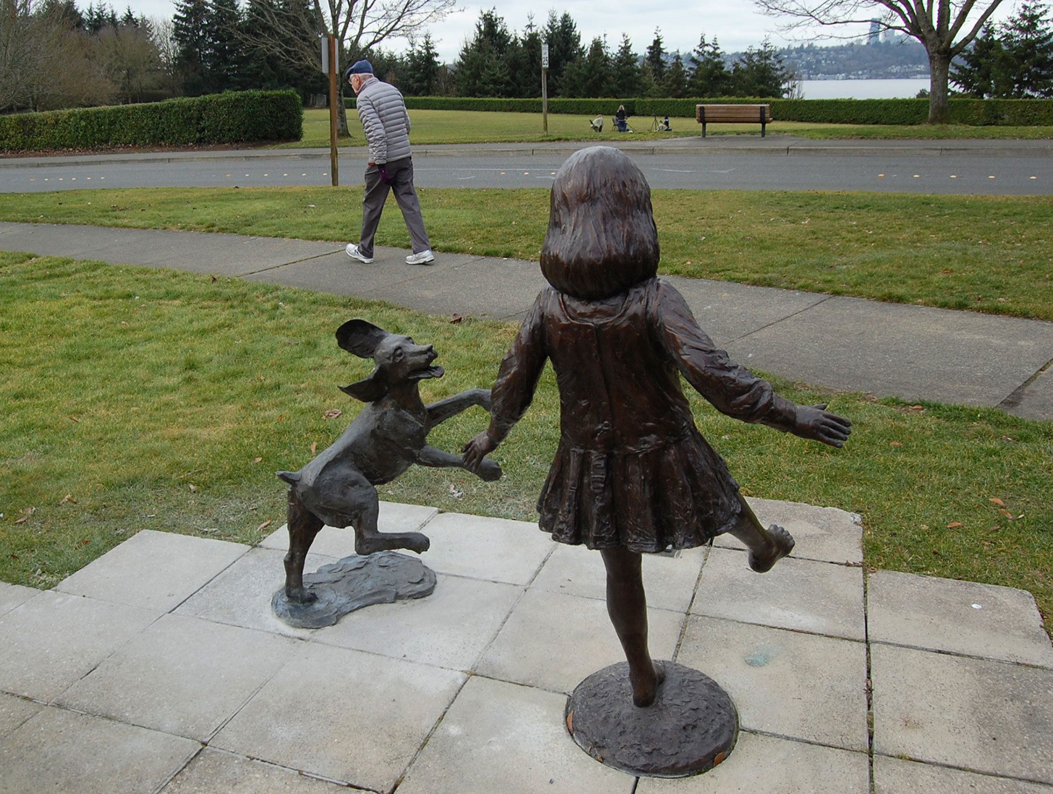 “Playful Pup,” by Gary Lee Price, is grouped with another sculpture titled “Stepping Forward,” by Dennis Smith. They are located in Aubrey Davis Park (formerly known as “The Park on the Lid”), just off West Mercer Way.