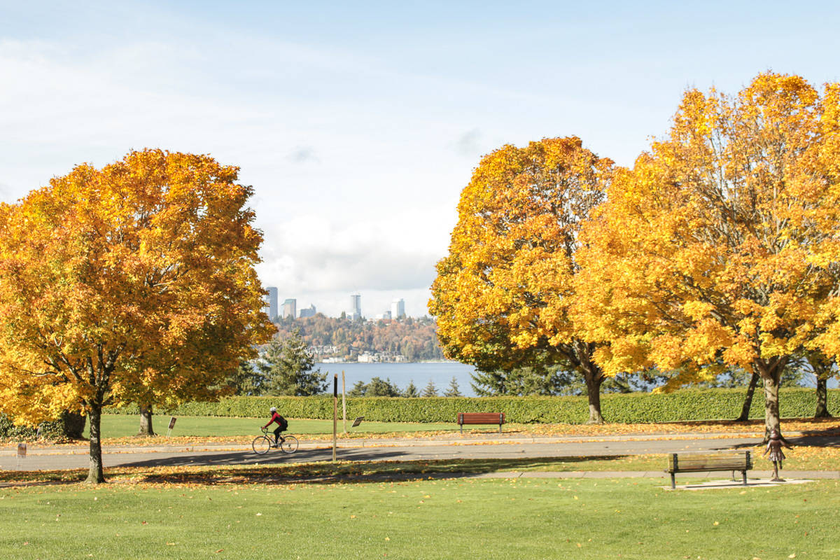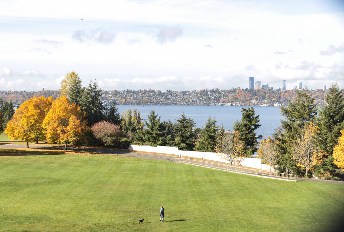 Sunshine hits the golden maple leaves and bright green grass in front of a picturesque view of Lake Washington and Seattle. It’s a beautiful fall day in a park that now stands where the community could have been literally divided by Interstate 90.