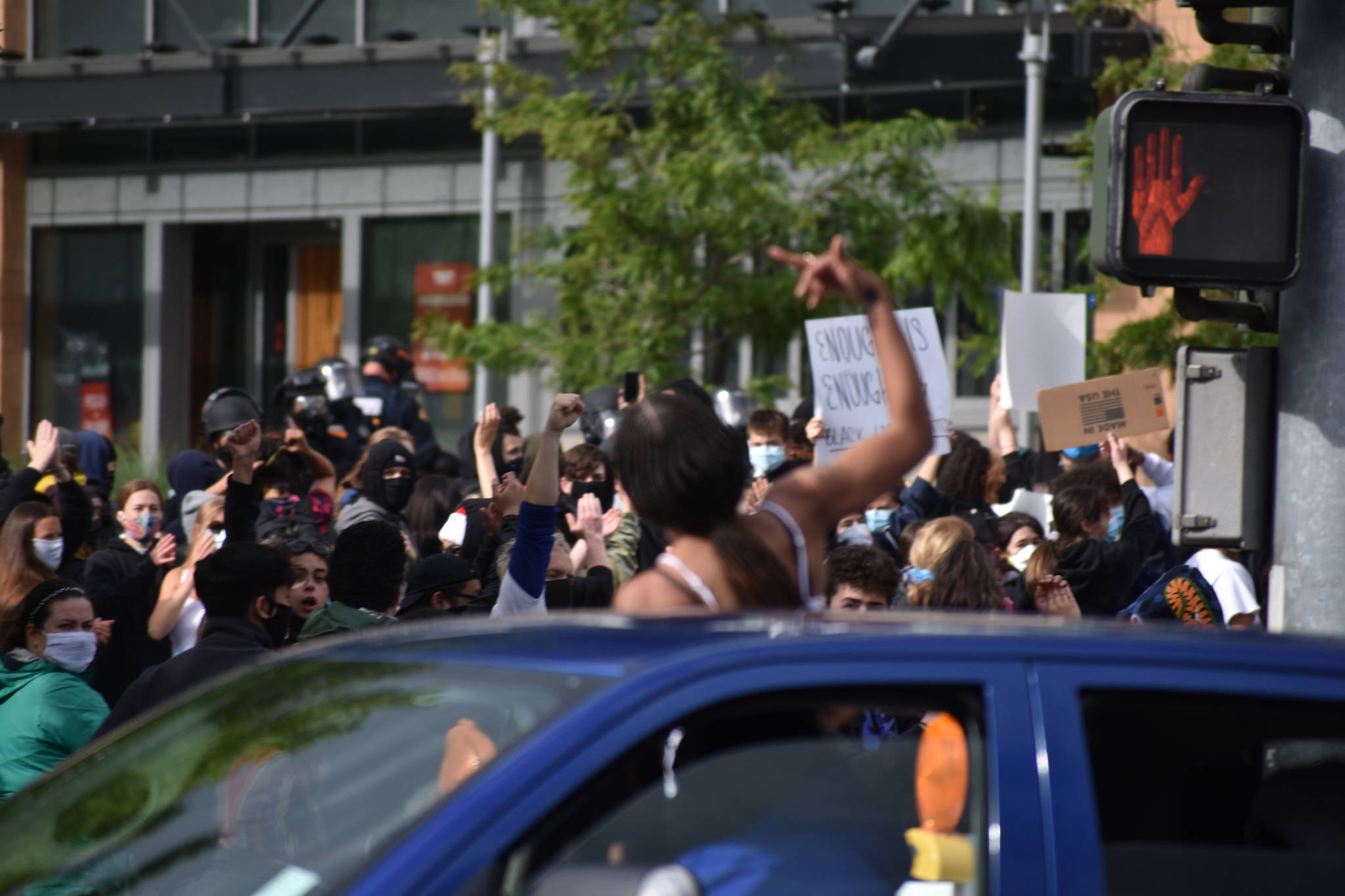 Throughout the late afternoon, protesters were corralled at the intersection of Bellevue Way Northeast and Northeast Fourth Street. The large group was chanting, kneeling and speaking out against racial injustice. Volunteers from the crowd were speaking using a megaphone.