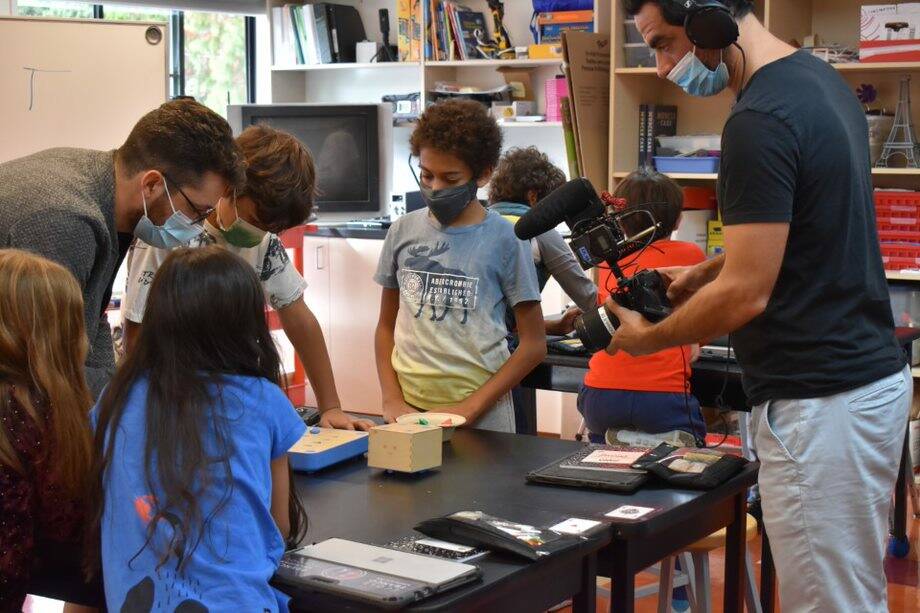 Technology teacher Fabrice Gunther teaches a lesson to fifth-grade students with the film crew off to the right. Photo courtesy of the French American School of Puget Sound