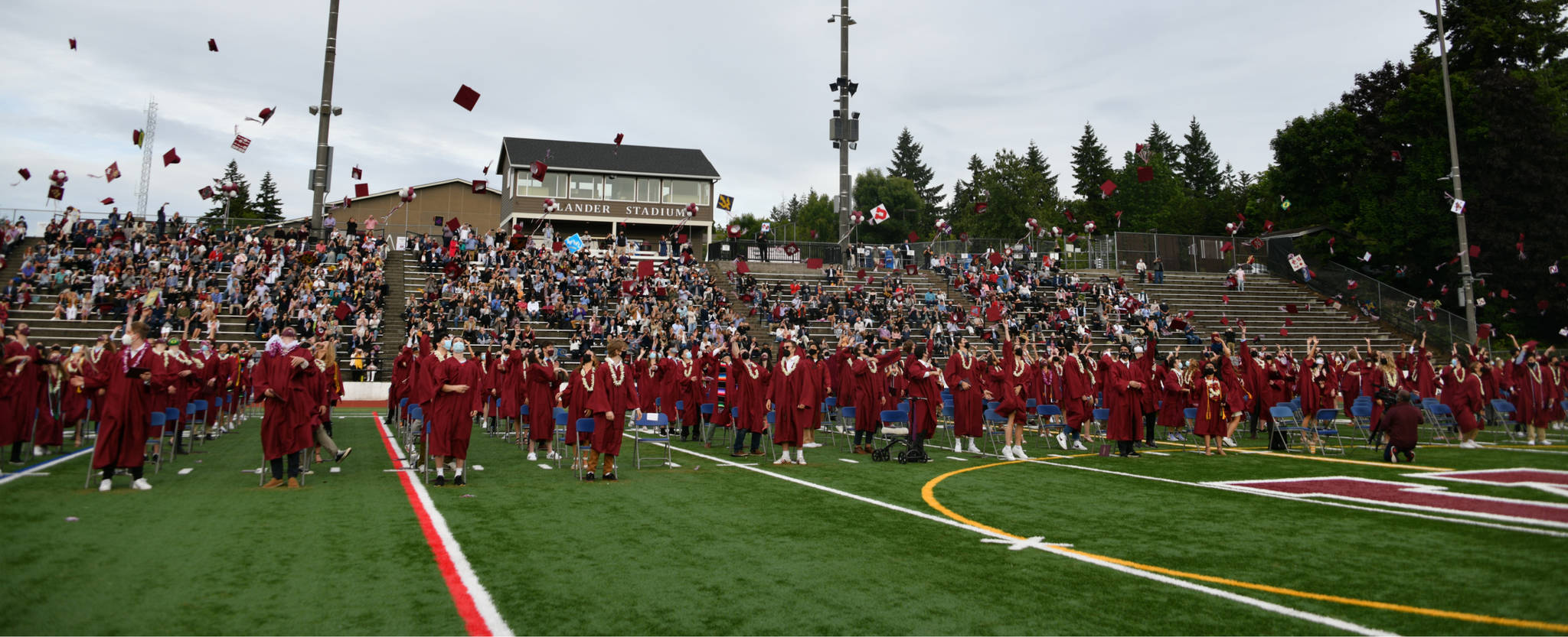 As people drove into the Northwood Elementary School parking lot, they could spot a sea of crimson in the form of caps and gowns worn by the 361 Mercer Island High School seniors who were soon to be graduates of the class of 2021.