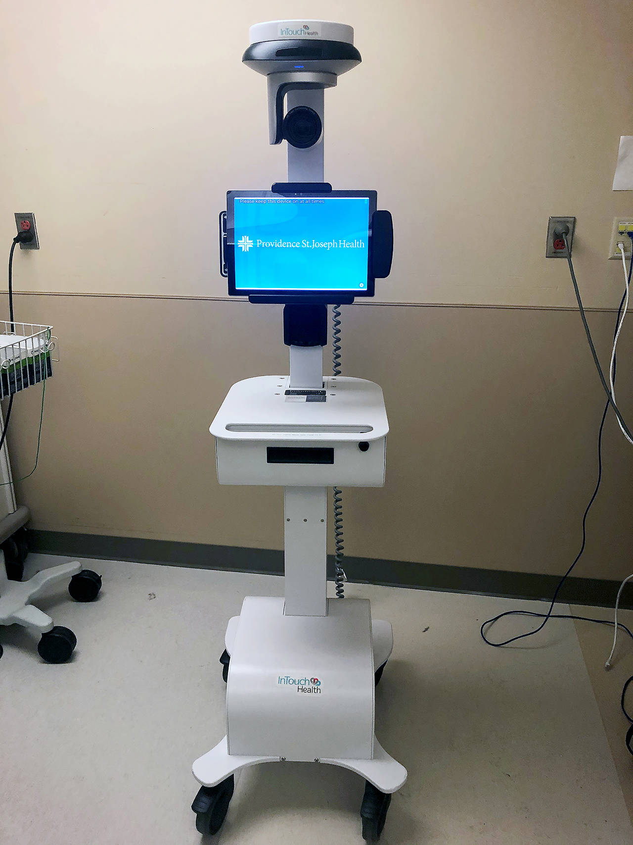 A robot helps treat the Snohomish County man in his 30s with coronavirus who since Monday has been in an isolated room at Providence Regional Medical Center Everett. Not shown is the robot’s stethoscope and microphone so the patient can talk with the doctor, who is not in the room. (Providence Regional Medical Center)