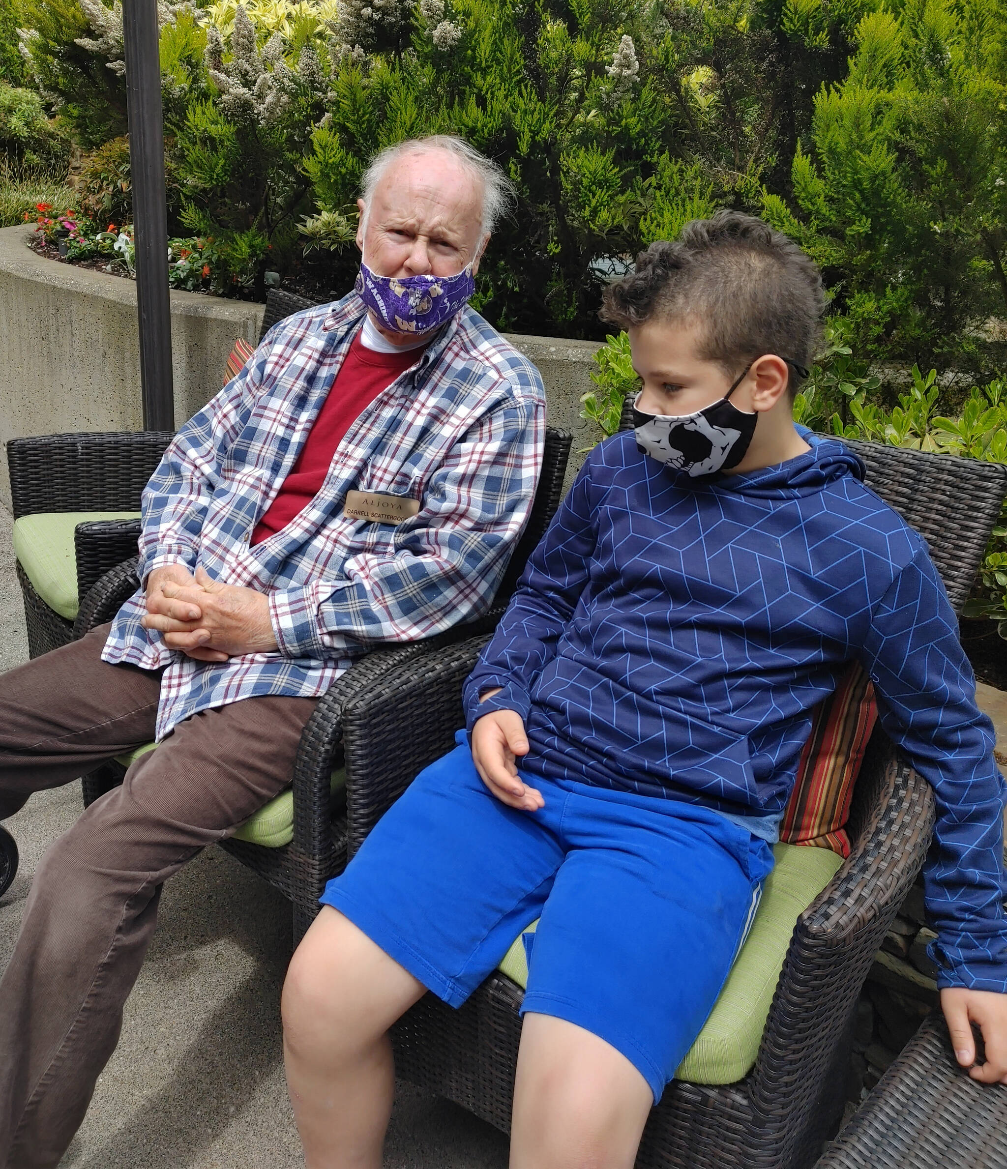 In one section of the garden, resident Darrell Scattergood sported a Washington Huskies mask while he chatted away with his student pen pal Ayden Wick, whose mask featured a skull.