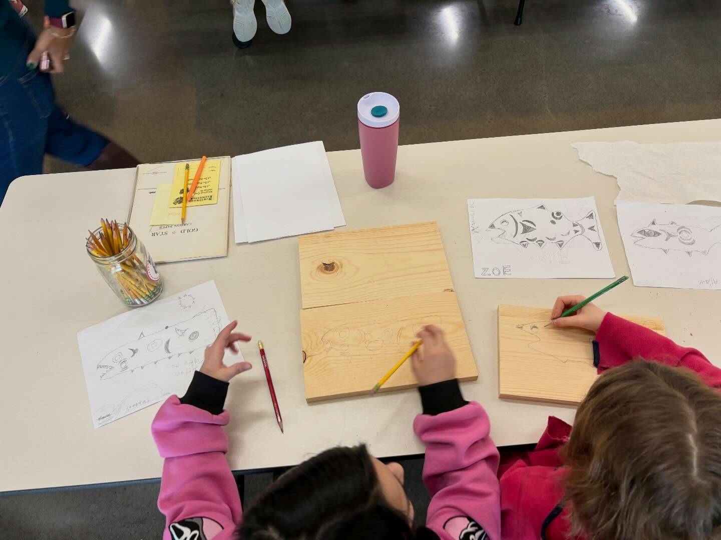 Storyteller, educator and artist Roger Fernandes of the Lower Elwha S’Klallum tribe recently visited Northwood Elementary School third-graders who gathered as a group in the school’s commons to learn how Native Americans created paint from charcoal. Students then painted a salmon they had traced earlier on a plank of wood. Fernandes is visiting third-graders in all four elementary schools this year through grants from the Mercer Island Schools Foundation. Photo courtesy of the Mercer Island School District