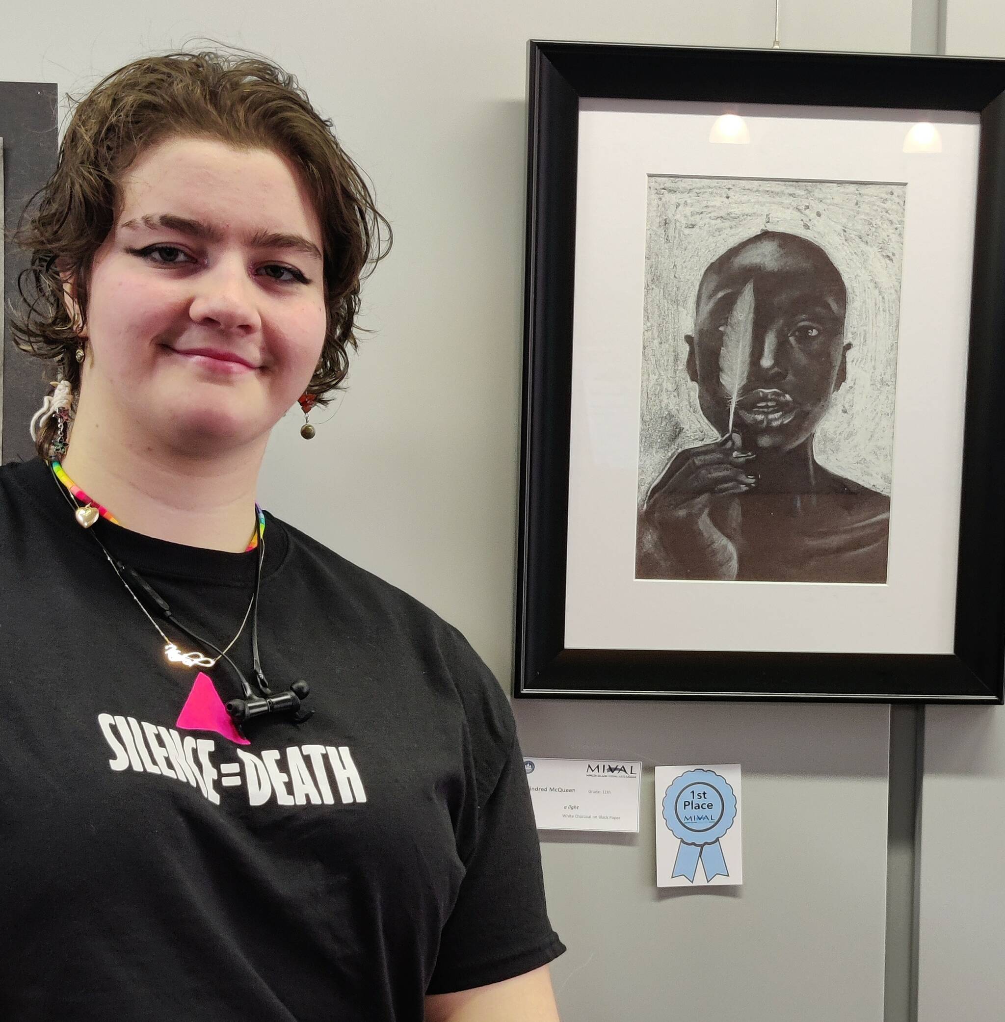 Ava Yeh won the President’s Award for her 2D acrylic-on-canvas painting, “A Summer Resolution,” and Kindred McQueen placed first in the grades 9-12 2D Art category for “a light,” which was drawn in white charcoal on black paper.