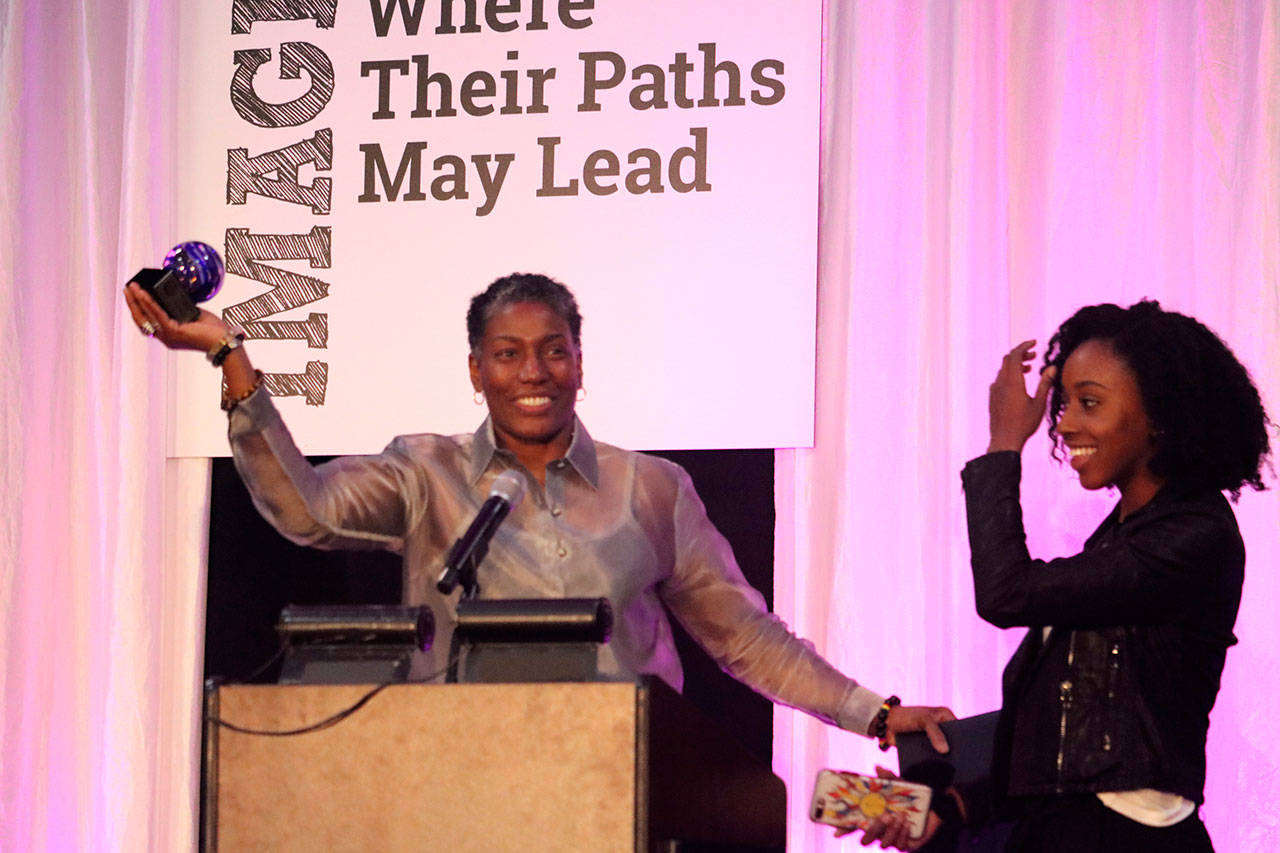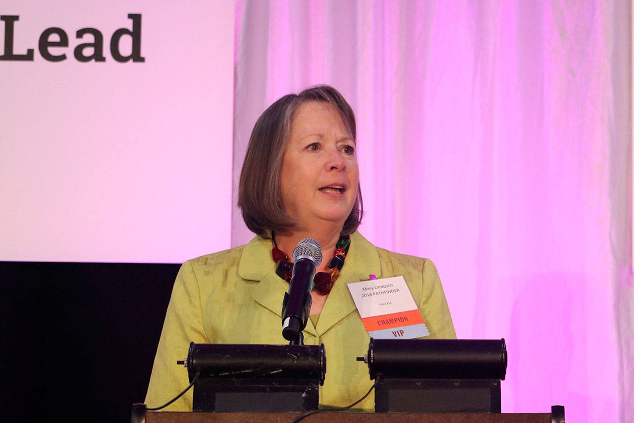 Mary Lindquist accepts the 2018 Pathfinder award and speaks about her time working in the district. Evan Pappas/Staff Photo
