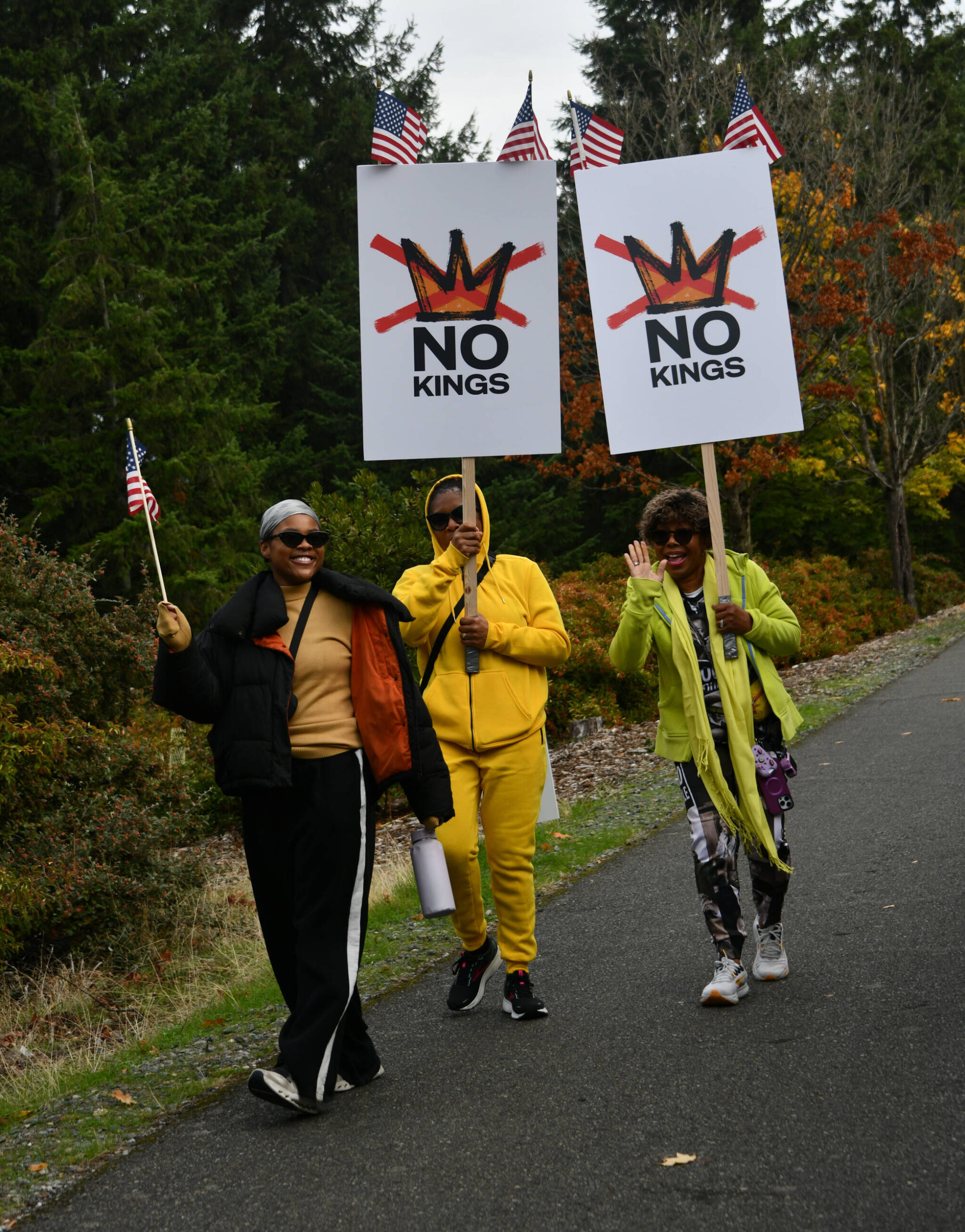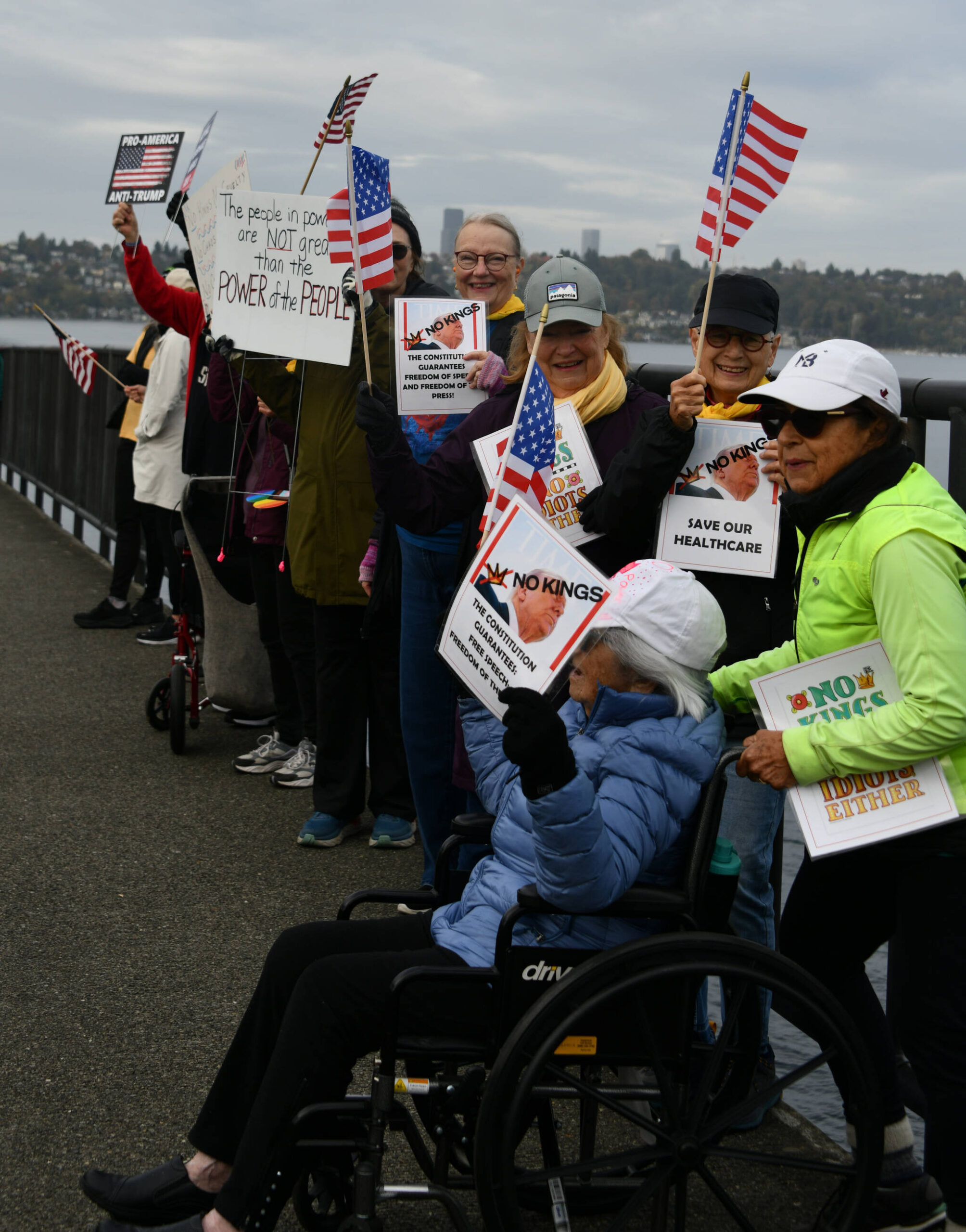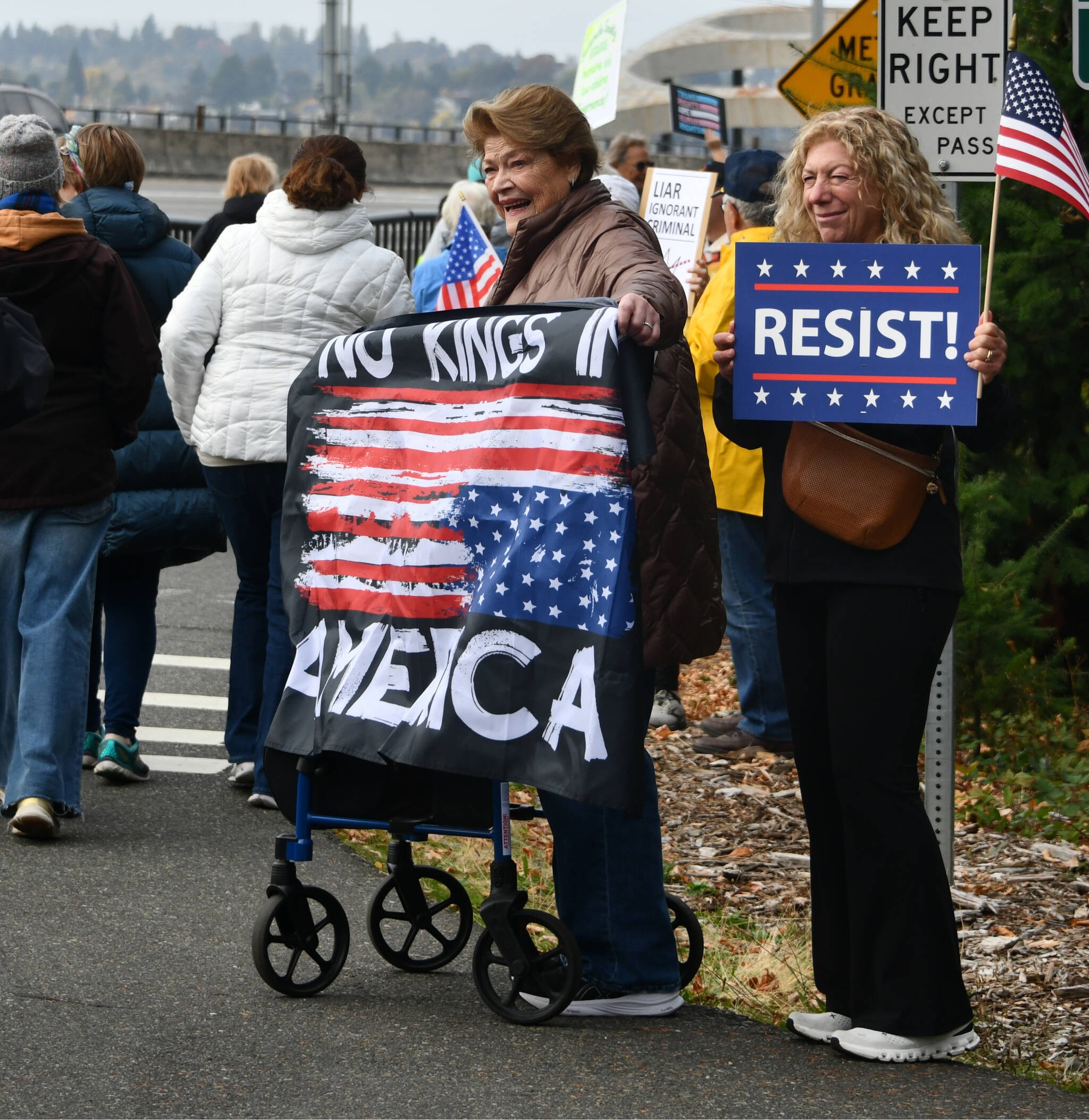 Mercer Island No Kings March participants walk across the Interstate 90 bridge coming from Aubrey Davis Park on Mercer Island on the morning of Oct. 18. In a press release, noting that more than 1,100 people attended the march, organizer Gene Robertson said protesters were peaceful and the mood was happy. “It was a powerful celebration of love of country and rejection of authoritarian overreach. Passing cars honked in support, and cyclists were patient,” the release added. According to the No Kings website: “On October 18, more than 7 million of us rose up at more than 2,700 events in all 50 states, DC, and cities worldwide to say: America has no kings, and the power belongs to the people.” The thousands of nationwide events are against President Donald Trump’s policies and actions. Mercer Island High School students Magnus and Shay said this was their first protest, and expressed concerns about unlawful cuts to science, and “100% misuse” of the military. Mercer Island resident Lora Ford said, “We are losing democracy bit by bit, and it’s important that we don’t get used to it.” She noted that her ancestors came on the Mayflower, “So I’m an immigrant!” Andy Nystrom/ staff photo