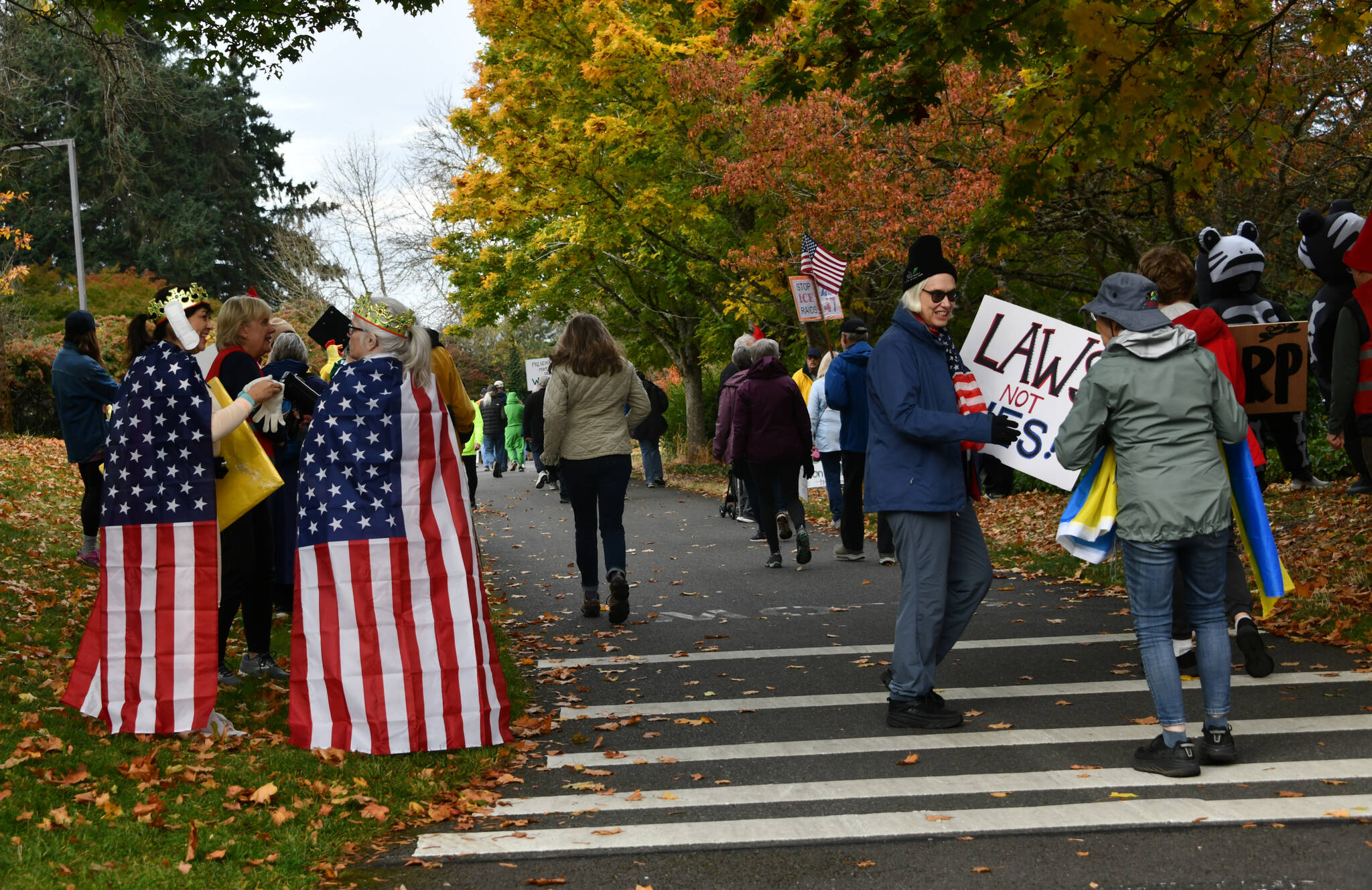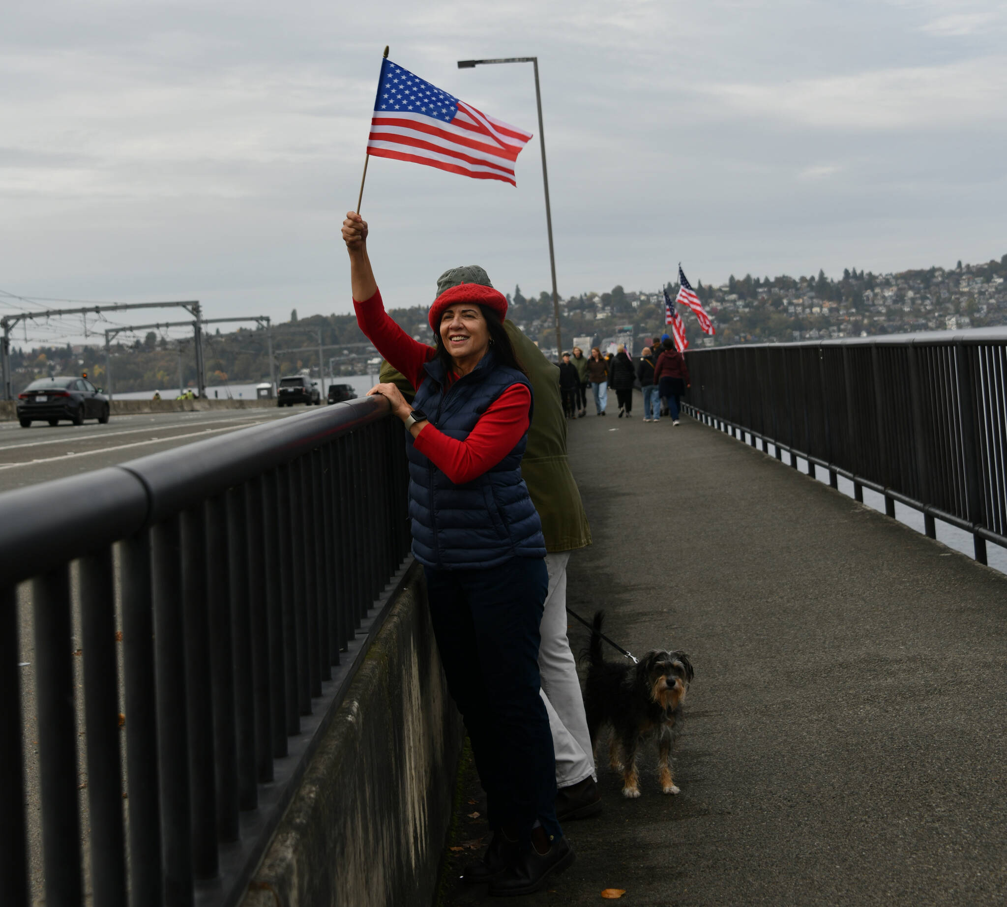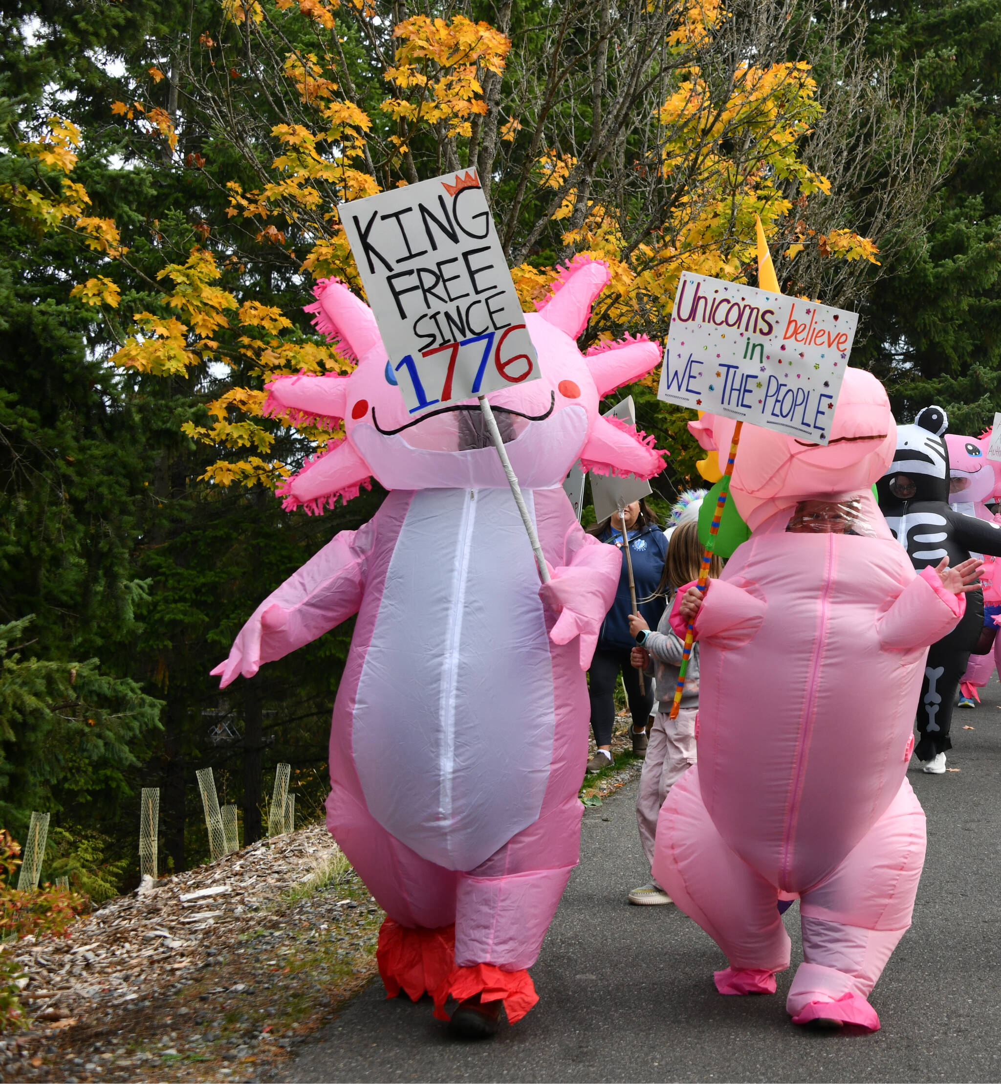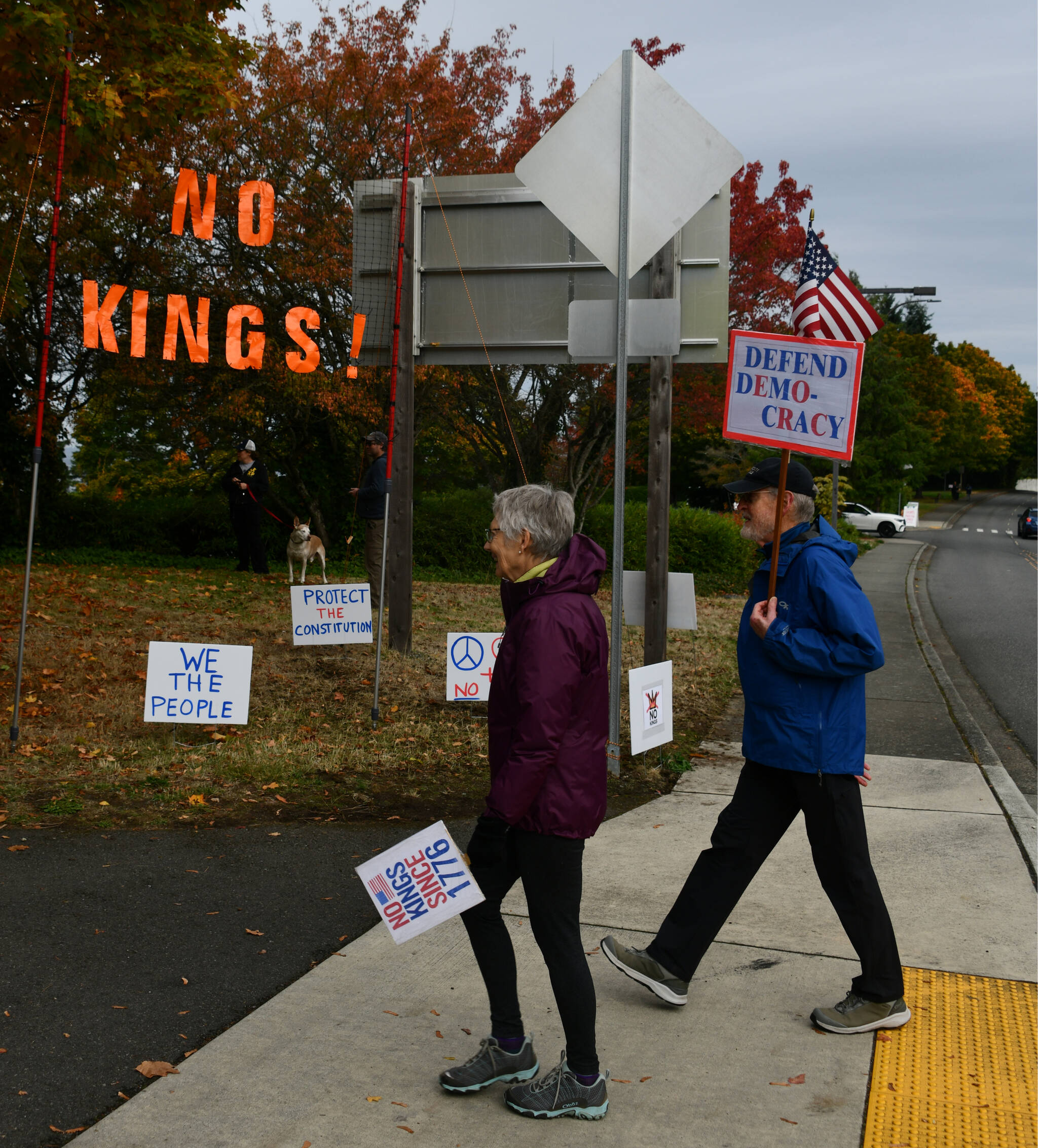 Mercer Island No Kings March participants walk across the Interstate 90 bridge coming from Aubrey Davis Park on Mercer Island on the morning of Oct. 18. In a press release, noting that more than 1,100 people attended the march, organizer Gene Robertson said protesters were peaceful and the mood was happy. “It was a powerful celebration of love of country and rejection of authoritarian overreach. Passing cars honked in support, and cyclists were patient,” the release added. According to the No Kings website: “On October 18, more than 7 million of us rose up at more than 2,700 events in all 50 states, DC, and cities worldwide to say: America has no kings, and the power belongs to the people.” The thousands of nationwide events are against President Donald Trump’s policies and actions. Mercer Island High School students Magnus and Shay said this was their first protest, and expressed concerns about unlawful cuts to science, and “100% misuse” of the military. Mercer Island resident Lora Ford said, “We are losing democracy bit by bit, and it’s important that we don’t get used to it.” She noted that her ancestors came on the Mayflower, “So I’m an immigrant!” Andy Nystrom/ staff photo