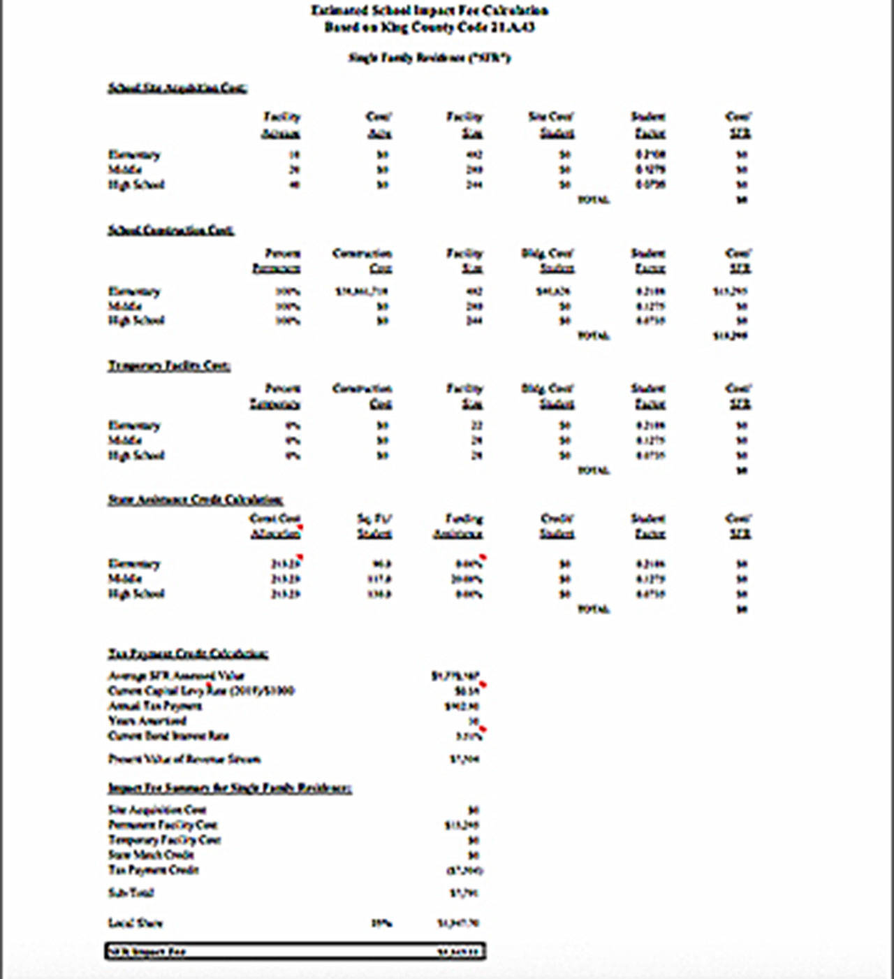 In its most recently adopted Six-Year Capital Facilities Plan, the district recalculated the amount of impact fees to be imposed and collected by the city. The impact fees are currently $4,035.47 per single family residence unit and $2,632.00 per multi-family unit.