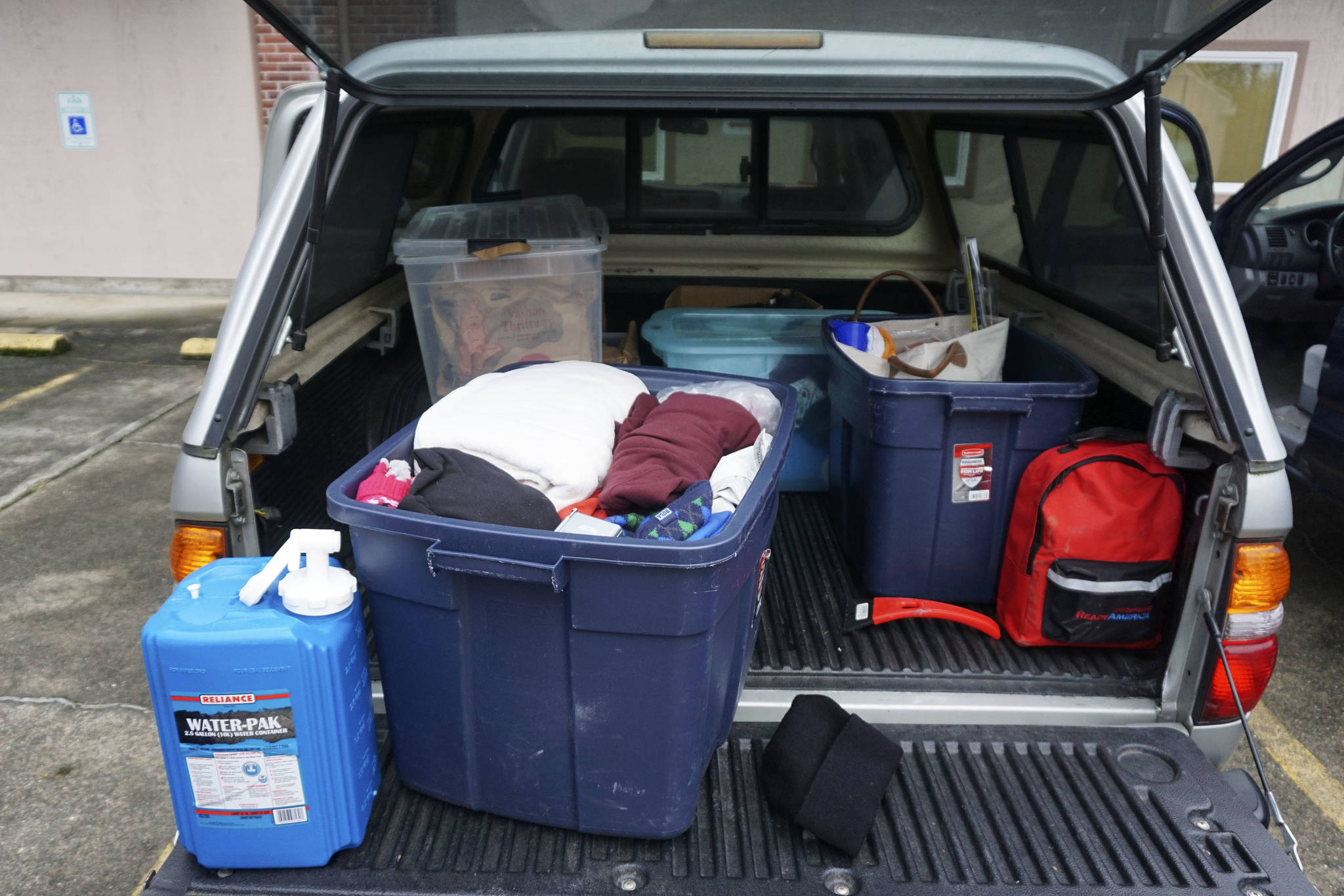 Vashon Island resident Vicky de Monterey Richoux keeps fully stocked emergency kits readily available at all times, much as some people keep spare pairs of glasses casually strewn about rooms or cars. On a recent Friday afternoon, she stood outside of the island’s fire training center with her car’s trunk pried open to reveal several plastic tubs. Removing the lid of one large blue container, she explained the contents: “Extra clothing, there’s a real warm jacket,” de Monterey Richoux said in a soft voice as she placed clothes from the bin onto the trunk bed. “I save my old stuff that doesn’t look nice, but I’m happy to lay under the car with it; first aid kit, safety vest, rain jacket, a blanket for my grandson,” she said as the pile steadily grew.