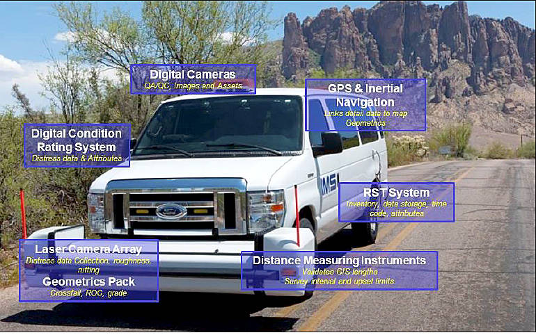 The first phase of surveying will include capturing deficiencies to measure pavement roughness, rutting, cracking, patching and other surface distresses. The IMS cameras will capture and track exact location using GPS.
