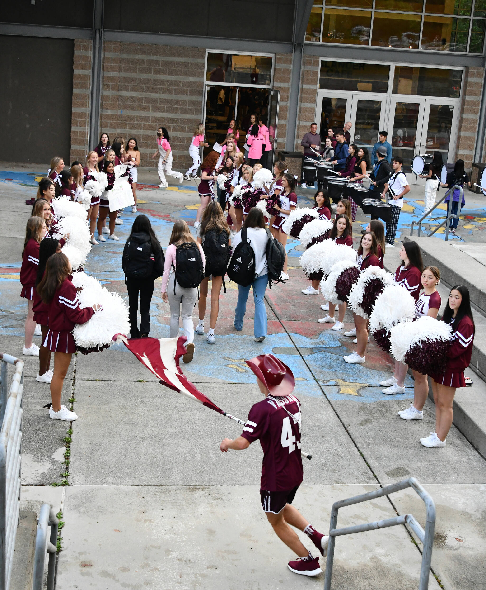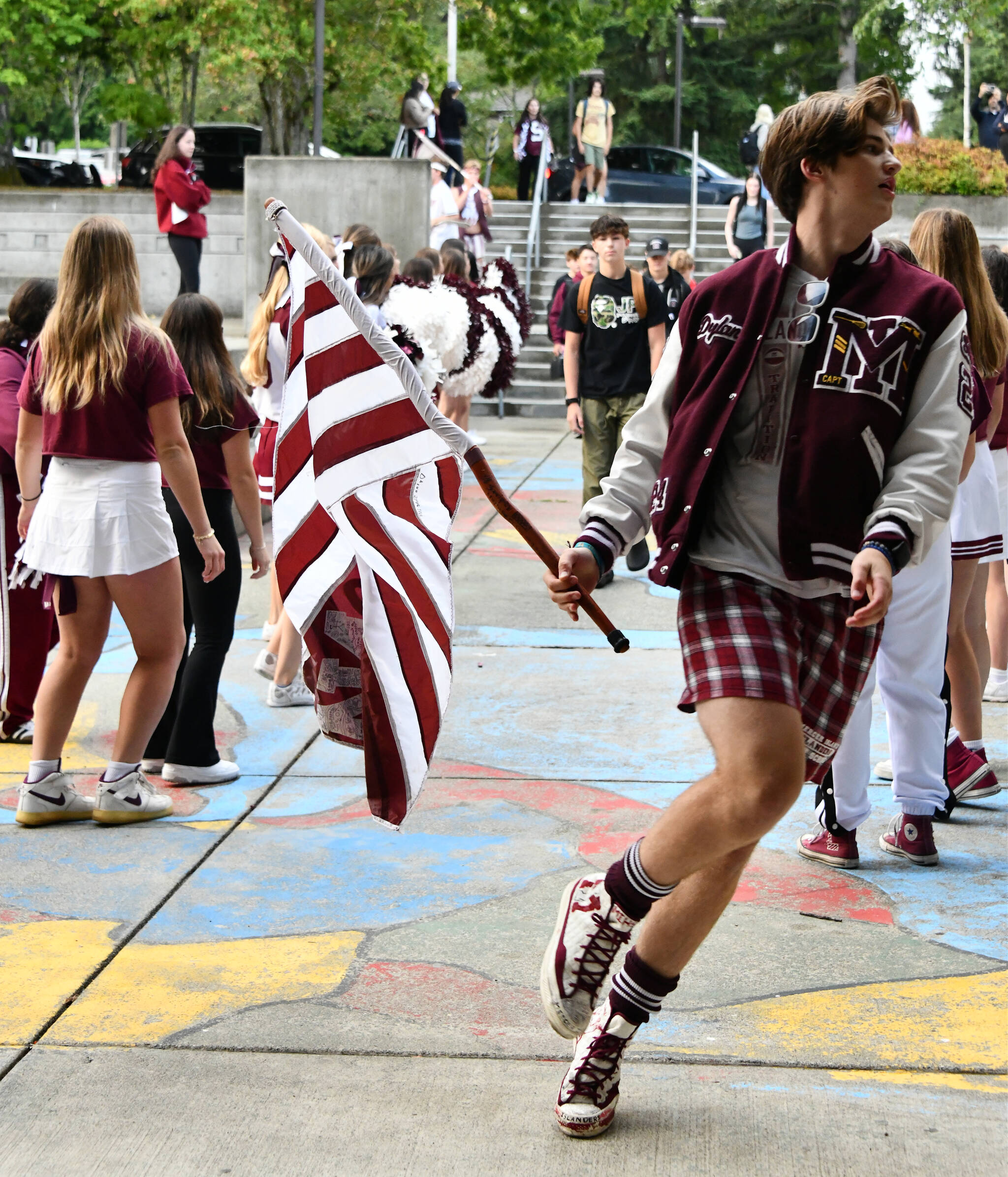 Members of the Mercer Island High School drill team and drum corps along with other students welcome ninth-graders onto campus on the first day of school on the morning of Aug. 30. Andy Nystrom/ staff photo