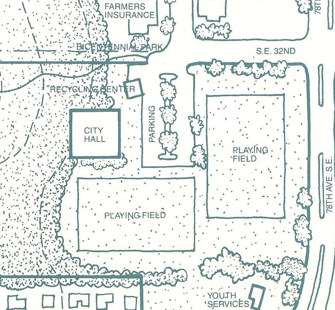 In 1960, the city incorporated and I arrived three years later. Since incorporation, there were multiple attempts to “energize” the city by filling Mercerdale with public and/or private buildings, culminating in the 1976 joint city/MISD community center plan (Reporter, Oct. 7, 1976; Nov. 4, 1976). That plan (see Figure 1) included City Hall, the library, a joint city/MISD maintenance/bus barn facility, a soccer field and parking. The community center plan was dependent on a public works federal grant that the city didn’t get.