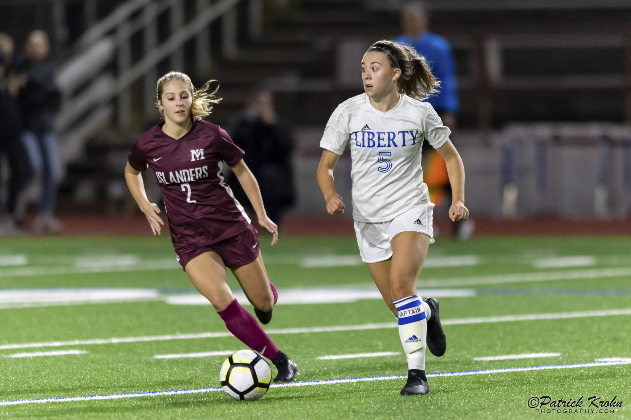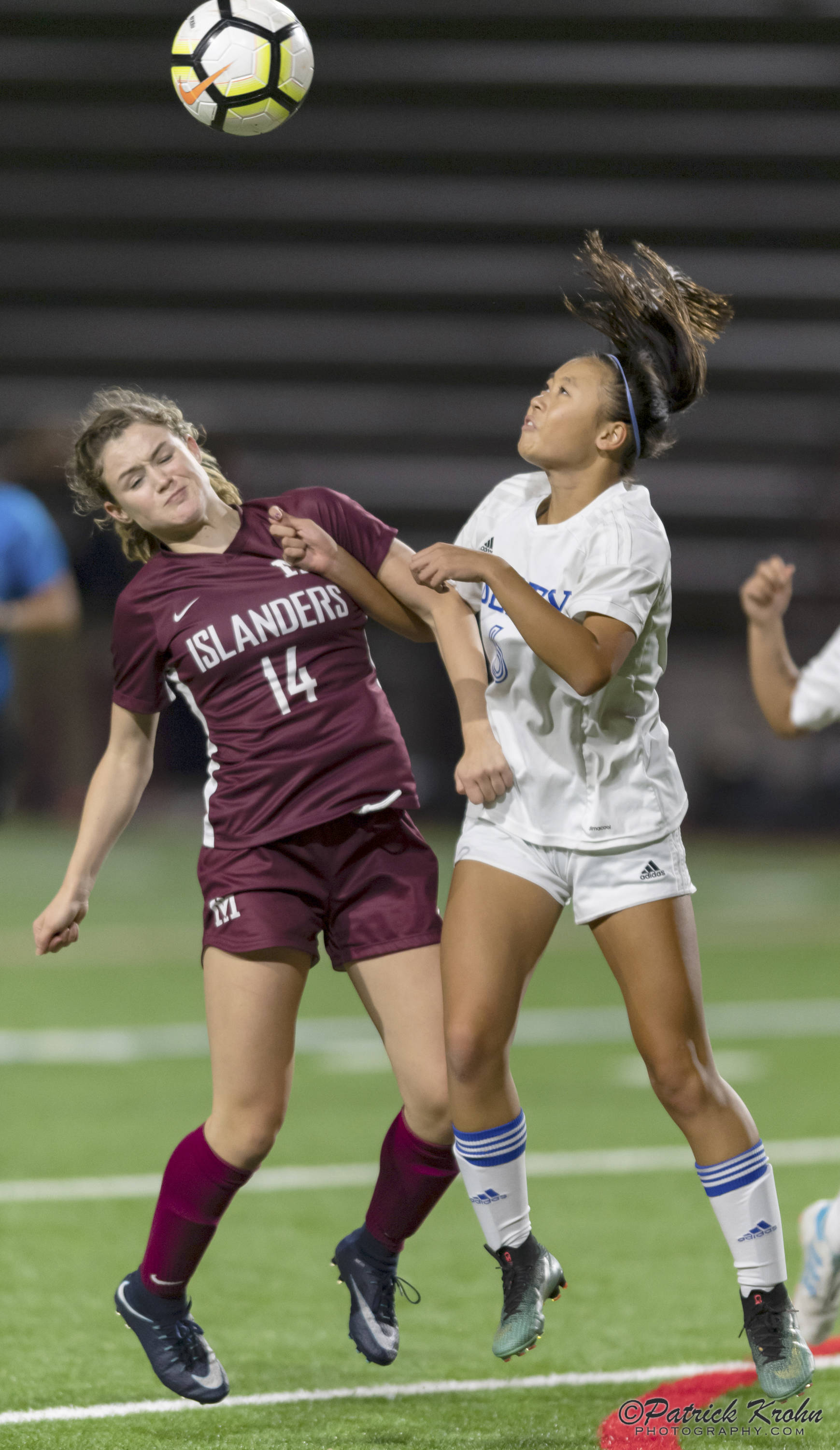 Mercer Island senior Ella Hensey, left, battles with Liberty defender Kelsey Le, right, for possession of a 50/50 in the air. Photo courtesy of Patrick Krohn/Patrick Krohn Photography